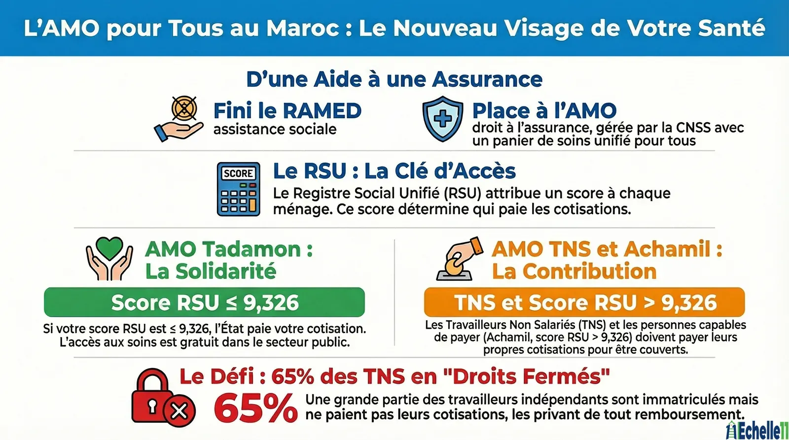 Guide détaillé sur l'Assurance Maladie Obligatoire (AMO). Découvrez le fonctionnement du passage RAMED vers Tadamon, les seuils du RSU, les paniers de soins unifiés et les procédures de remboursement CNSS.